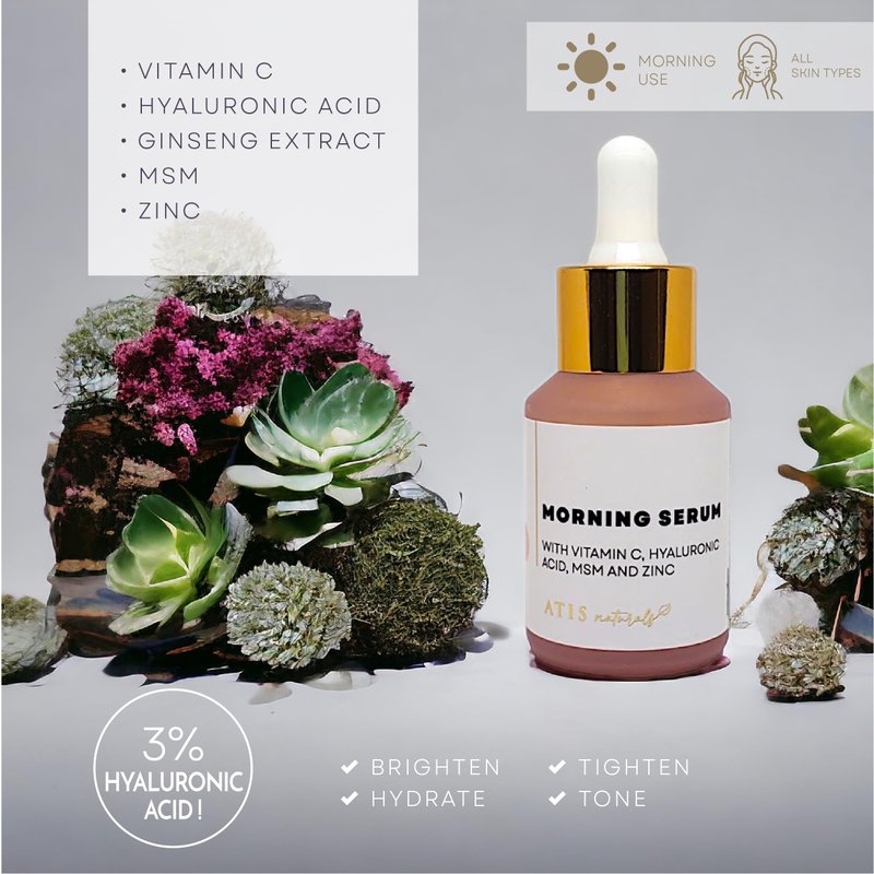 Morning Serum with Hyaluronic Acid, Vitamin C, MSM, and Zinc: Start your day on the right note with this morning serum. Packed with the dynamic duo of Hyaluronic Acid and Vitamin C, it's your shield against the daily environmental stressors. Hyaluronic Acid delivers deep hydration, plumping your skin for a youthful glow, while Vitamin C's antioxidant prowess fights off free radicals and brightens your complexion. MSM and Zinc further enhance your skin's vitality, promoting a toned and rejuvenated appearance.