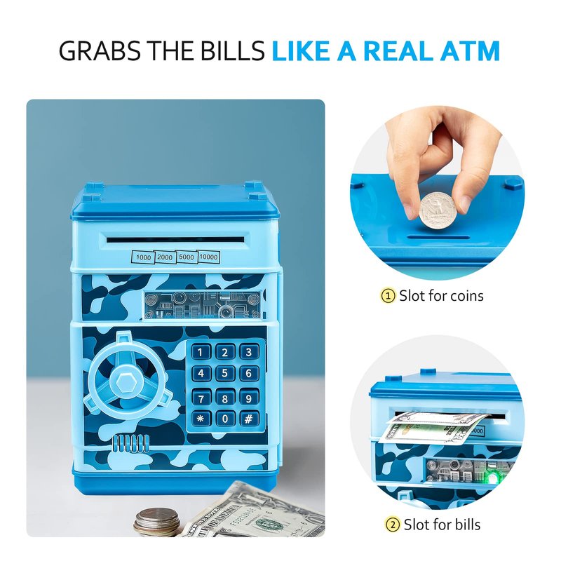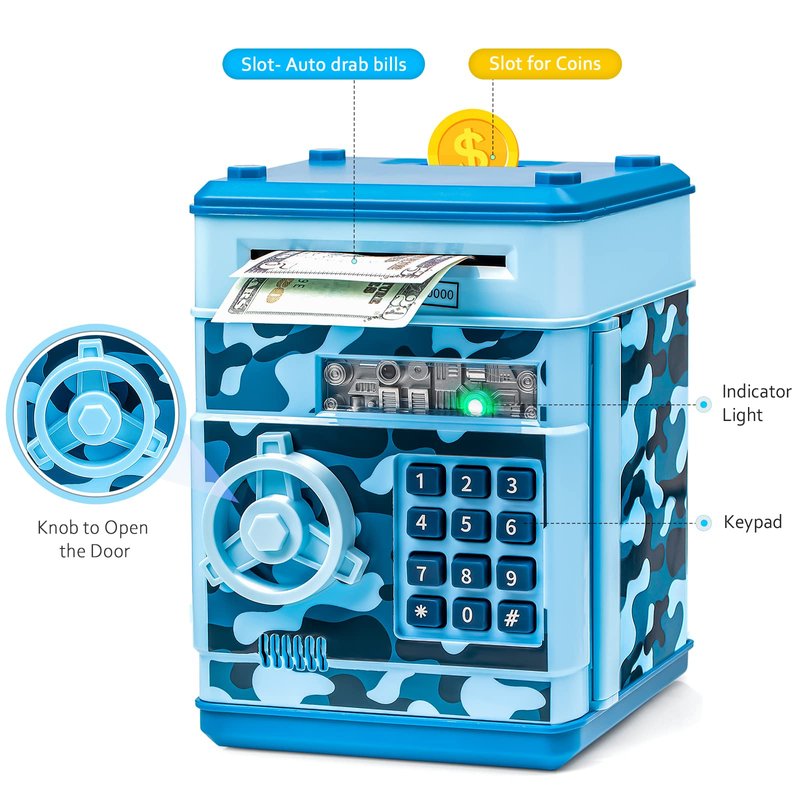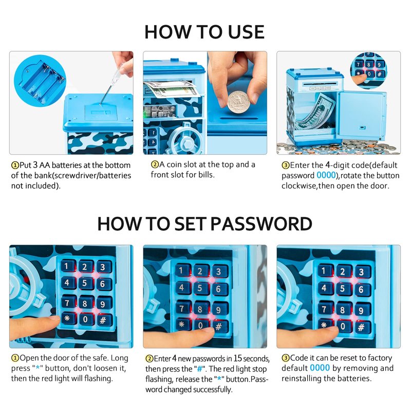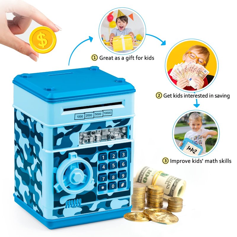 - Keep Safe Money: Open the door of the kids safe with 4-digit code(default password 0000). ATM piggy bank for boys, easy to program a personalized code, great for what your boys/girls needed to keep their money safe! Kids will love hiddening their "valuables" in this coin bank.