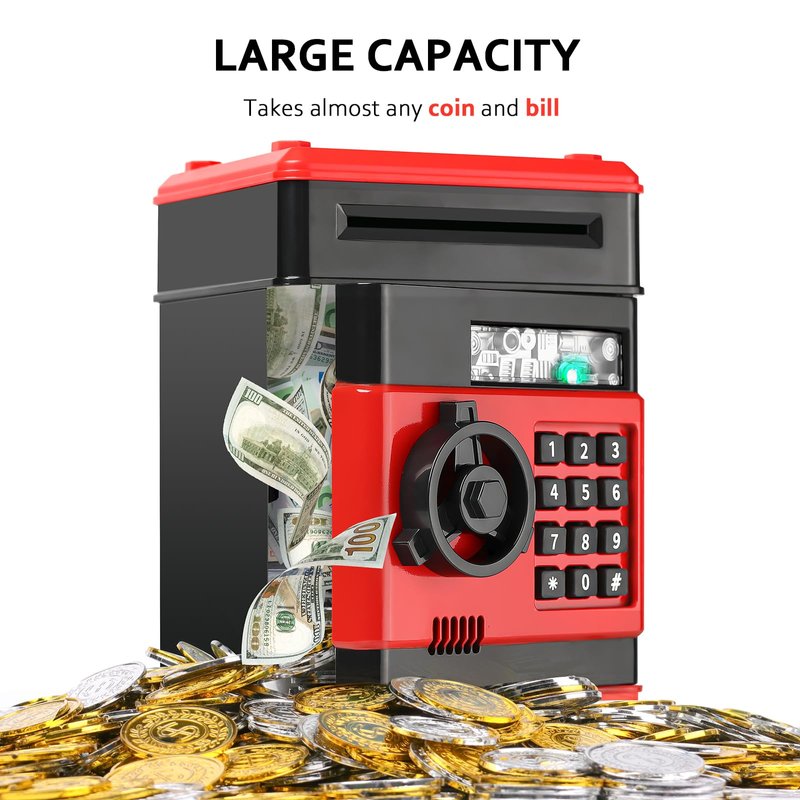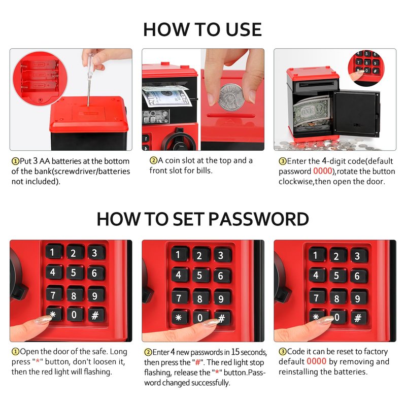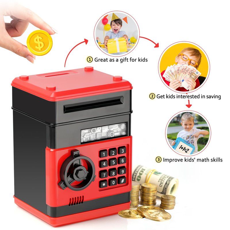 - Keep Safe Money: Open the door of the kids safe with 4-digit code(default password 0000). ATM piggy bank for boys, easy to program a personalized code, great for what your boys/girls needed to keep their money - safe! Kids will love hiddening their "valuables" in this coin bank.