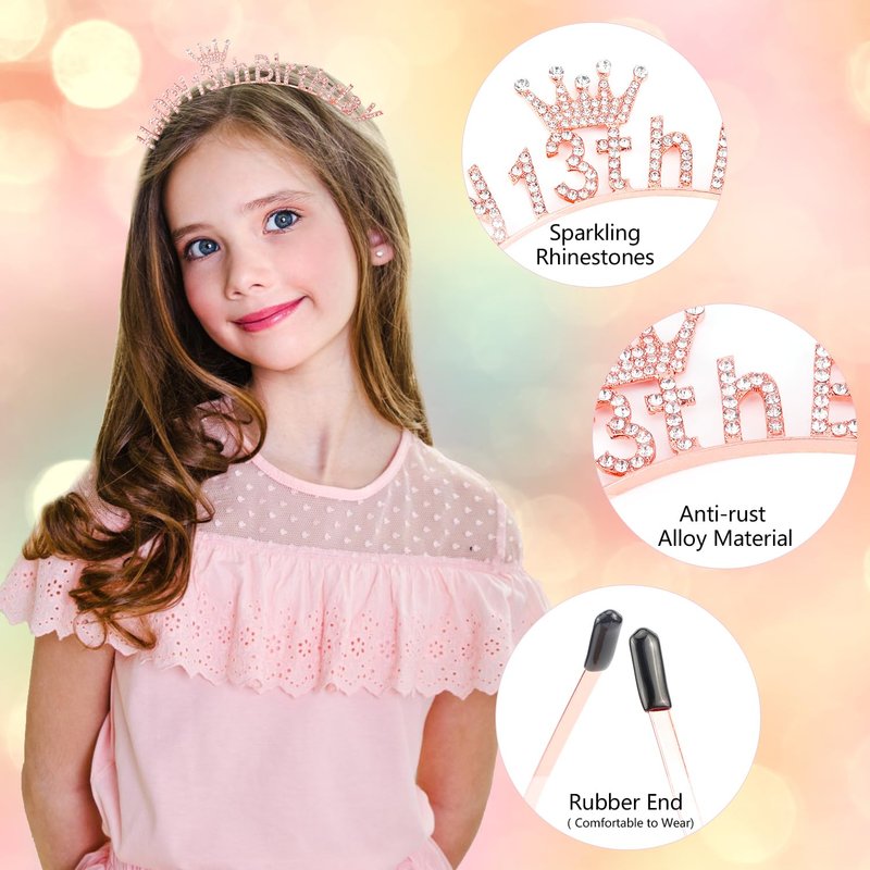 Atoden 13th Birthday Decorations for Girls Rose Gold 13 Year Old Tiara Crown Headbands for Girls Head Band 13th Birthday Gifts for Girls