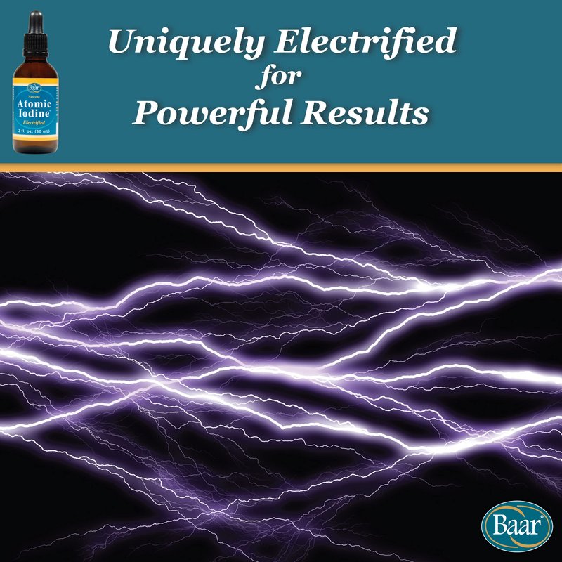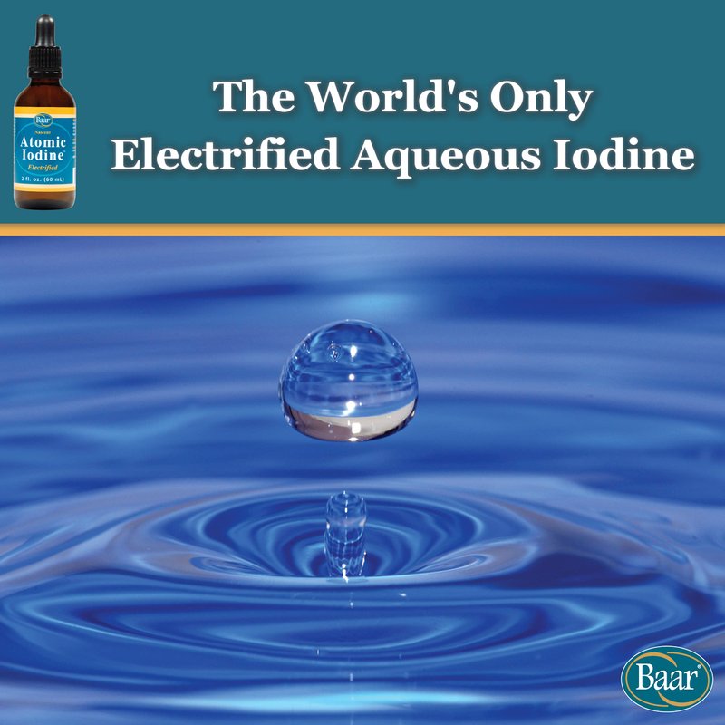 Baar Atomic Iodine is the world's only electrified and stable non-toxic aqueous form of iodine that liberates the element in an atomic or nascent state. Atomic Iodine, was developed by Dr. Sunkar A. Bissey in the 1920's. His product was used for many health issues. Iodine in the nascent state is thought to be better absorbed by the body.