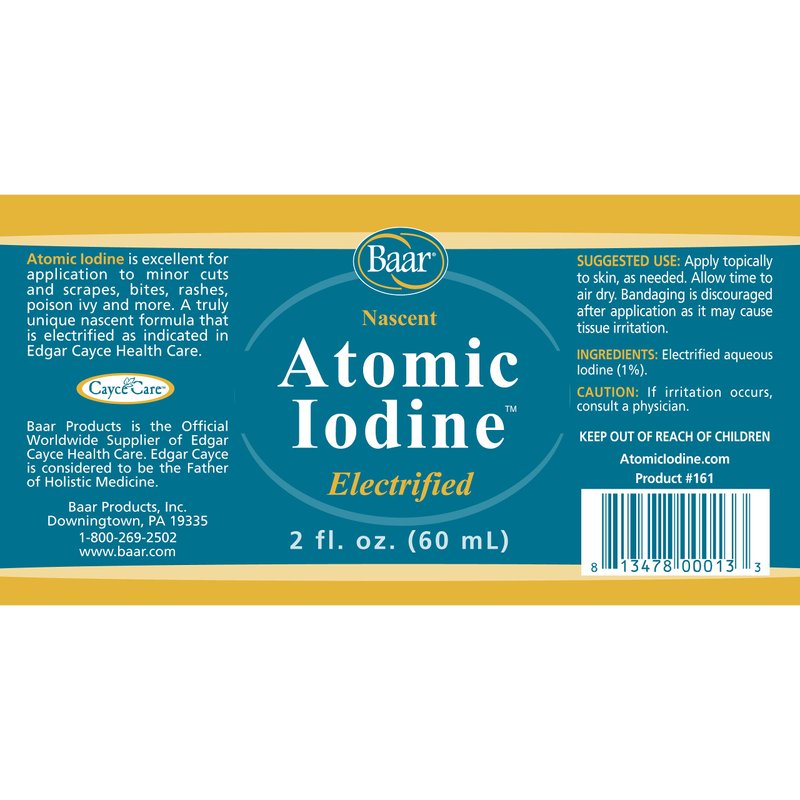 Baar Atomic Iodine is excellent for external application to cuts, boils, bites, rashes, poison ivy and more. A truly unique and economic product that is electrified as indicated in the Edgar Cayce Health Care Philosophy. Not intended for daily use. Tested Free of Radio-Activity.