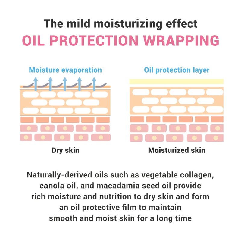 - OIL PROTECTION WRAPPING: Naturally-derived oils such as vegetable collagen, canola oil, and macadamia seed oil provide rich moisture and nutrition to dry skin and form an oil protective film to maintain smooth and moist skin for a long time