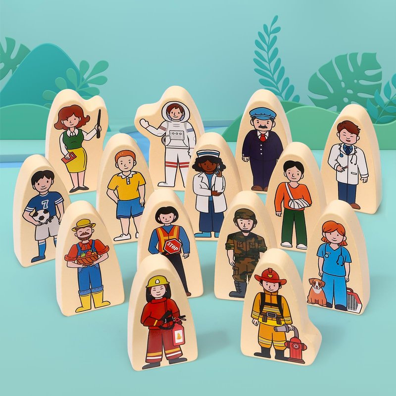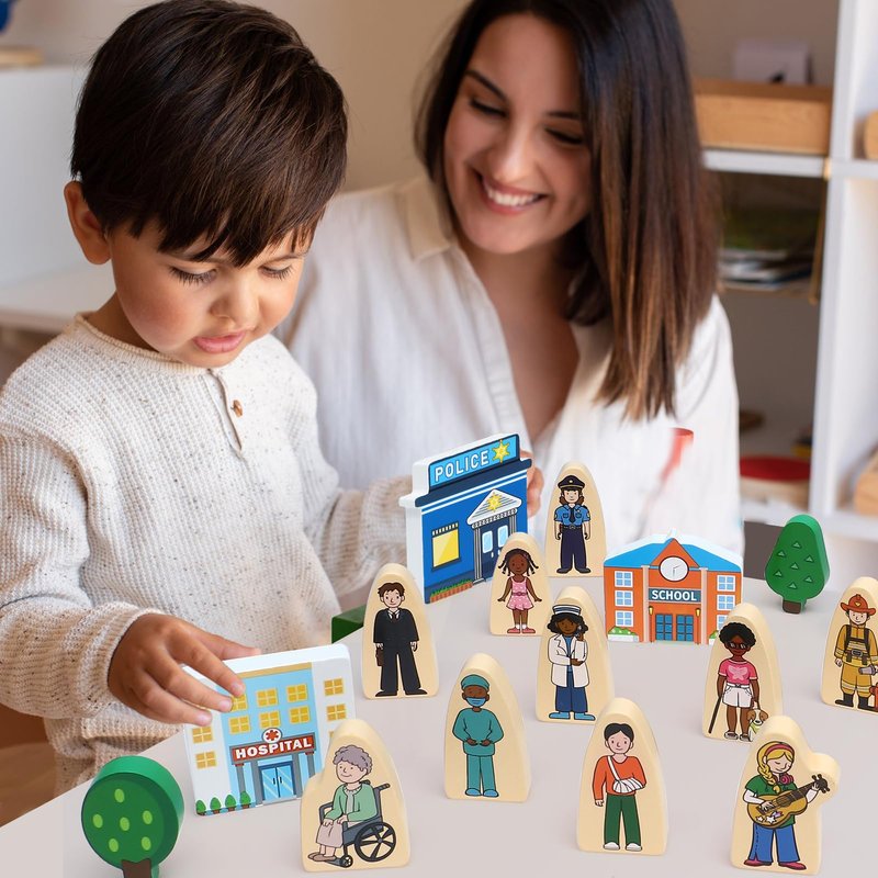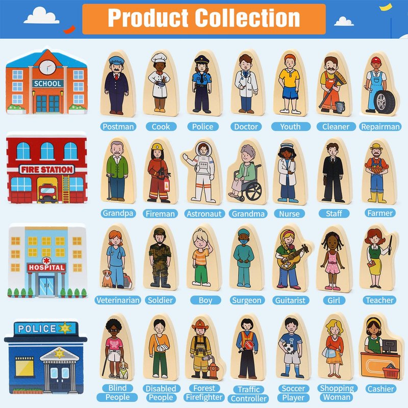 • Wooden Character Set - A must-have for little boys and girls that love playing people toys. Comes with an assortment of about 28 pieces wooden occupations blocks, 4 trees and 4 pieces wooden play sites including hospital, school, police and fire station. Let your children create an imaginative community with unlimited play possibilities