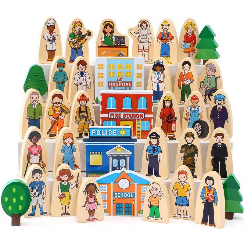 Atoylink 36Pcs Wooden Community Helpers Pretend Play Toys for Kids 3 4 5 6 Year Old, Little People Figures Wooden Blocks Occupations Dress up Toddlers Preschool Learning Toys Boys Girls Birthday Gifts
