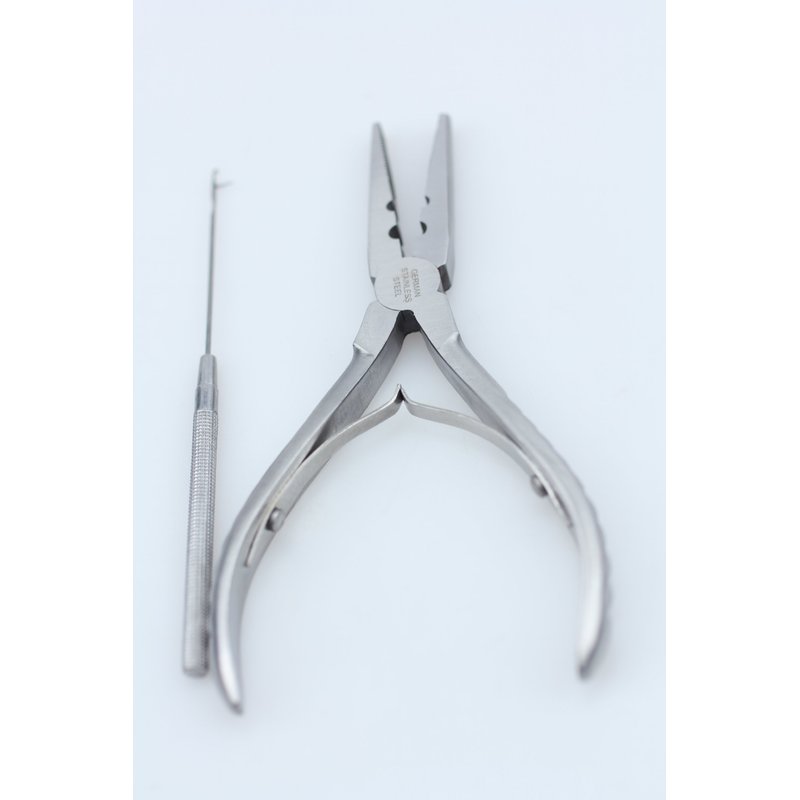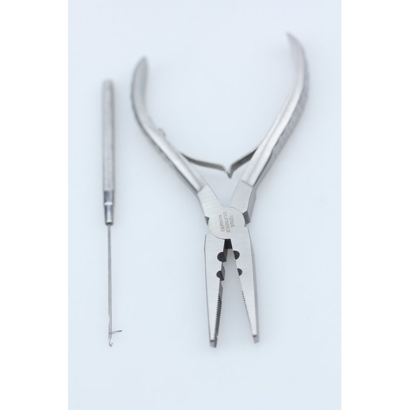 Stainless Steel Clamping Tool: This is the deluxe micro ring all-in-one opening and closing tool. Most micro ring tools have a very shape cutting feature with a plastic handles. This clamping tool is curved for a comfortable arm position while working, for less stress on your hand and arm muscles. Micro Ring Pulling Needle: This needle is beautifully ornate and made of stainless steel. Insert pulling needle through a tube, grab the hair with needle tool and slide through the tube hole. Apply pressure to flatten the tube using clamping tool. It is absolutely better than the cheaper needle made of wood or plastic.