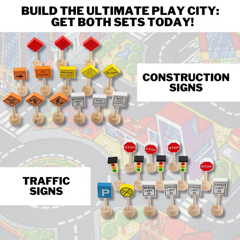 What family road trip would be complete without a highway construction zone? Now your toy & vehicle play can be complemented by our complete 14-piece set of road construction signs in real wood.