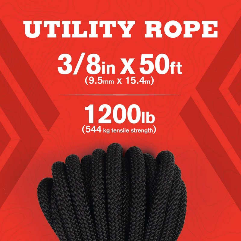 - 3/8 inch X 50ft Braided Utility Rope - 1,200 lbs.Black Made in USA. UV resistant, full fiber core, lightweight and built to last.