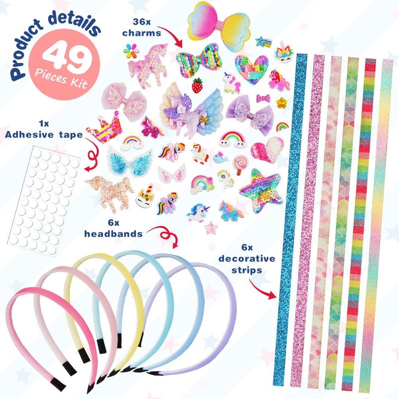 - 【Girly Hair Accessories Making Kit】Our craft kit for girls provides a rich material pack so your child can make their own beautiful headbands. Our hair accessories kit includes: 36 beautiful accessories of different styles (such as unicorn, rainbow and other small accessories), 6 colorful hair bands, 6 decorative tapes and 1 sheet of glue dots. Note: Accessories may be randomized.