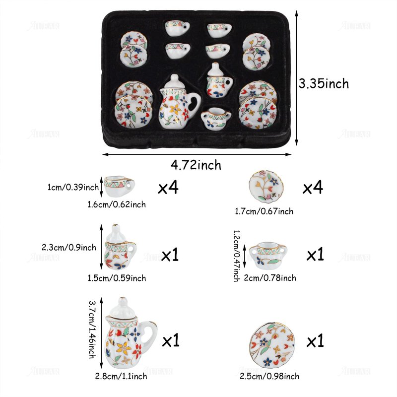 - QUANTITY: 1 set 1 : 12 miniature tea set ,included 1 x Teapot, 1 x Sugar Bowl, 1 x Creamer, 4 x Dishes, 4 x Cups, 4 x Saucers