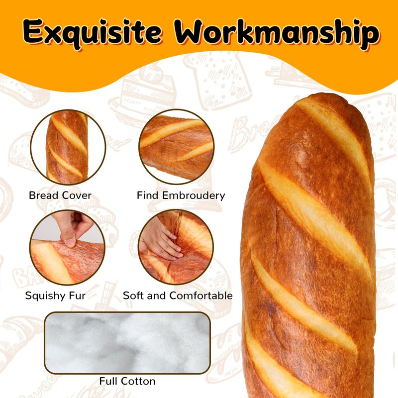 - [Realistic Appearance]: The French style bread designed plush pillow is made of skin friendly plush fabric, filled with high-quality PP cotton, soft and comfortable, very suitable for hugging. You can use it as a human pillow, neck pillow, sleeping pillow, waist cushion, and pillow. The simulated toast stuffed pillow adopts 3D printing technology, with realistic shapes and details, resembling a delicious large bread. Although the shape is realistic, please note that it is not edible