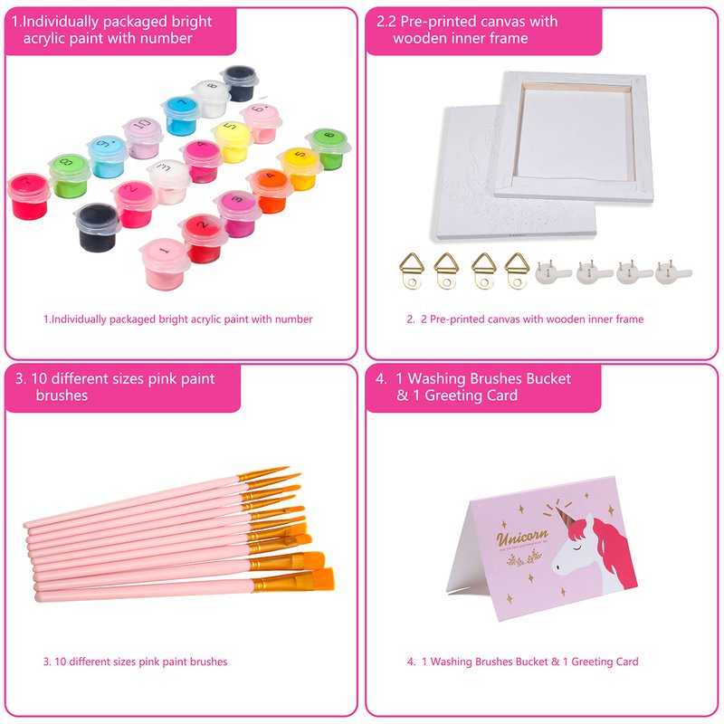 - 2 Pieces PAINT BY NUMBERS KITS for Unicorn - Painting by numbers kit for kids age 8 - 12 include 37 pieces painting accessories packed in one exquisite gift box, come with 2 pieces paint by numbers canvas(measured 8x8 inch)with 4 pairs of fixing hooks, 19 acrylic colors case, 10 different size pink paintbrushes, 1 greeting card. It is the wonderful Christmas gift to girls.