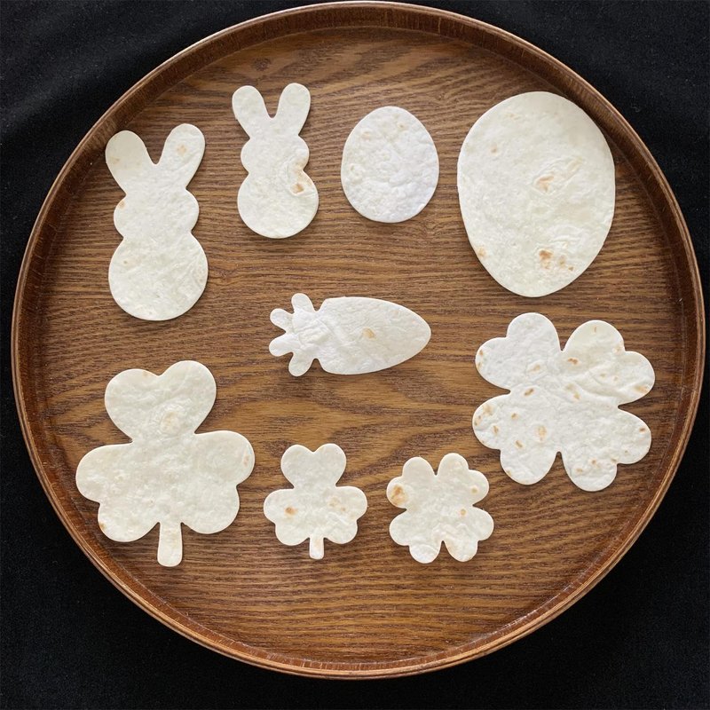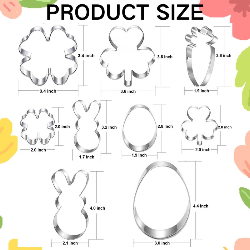 - Package:9 assorted shapes cookie cutters, Large shamrock, small shamrock, large clover, small clover, large bunny, small bunny, large egg, small egg and carrot.