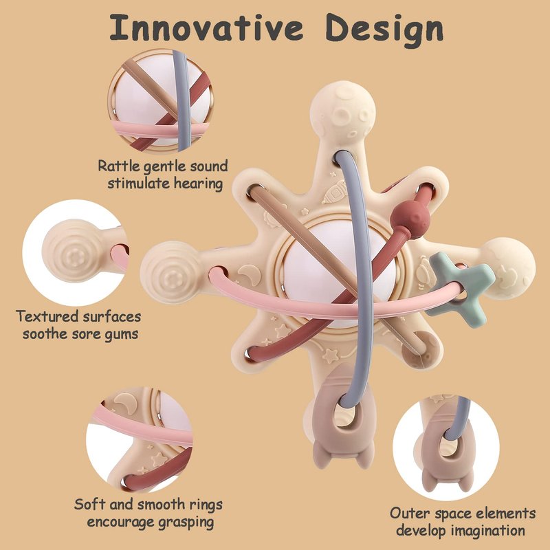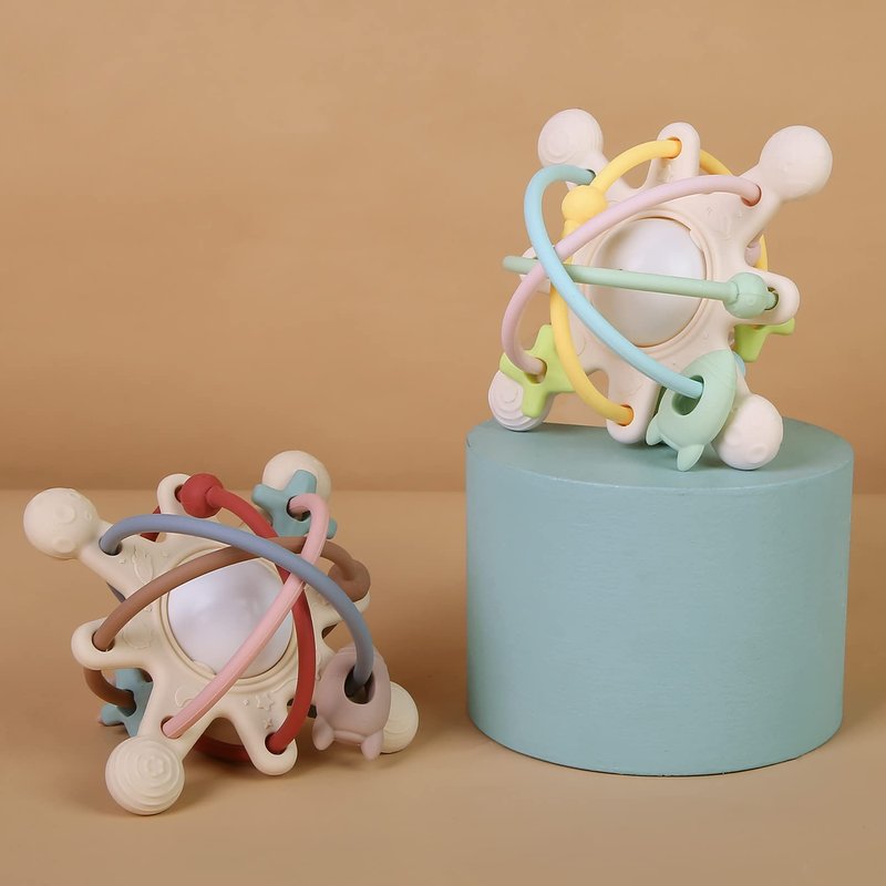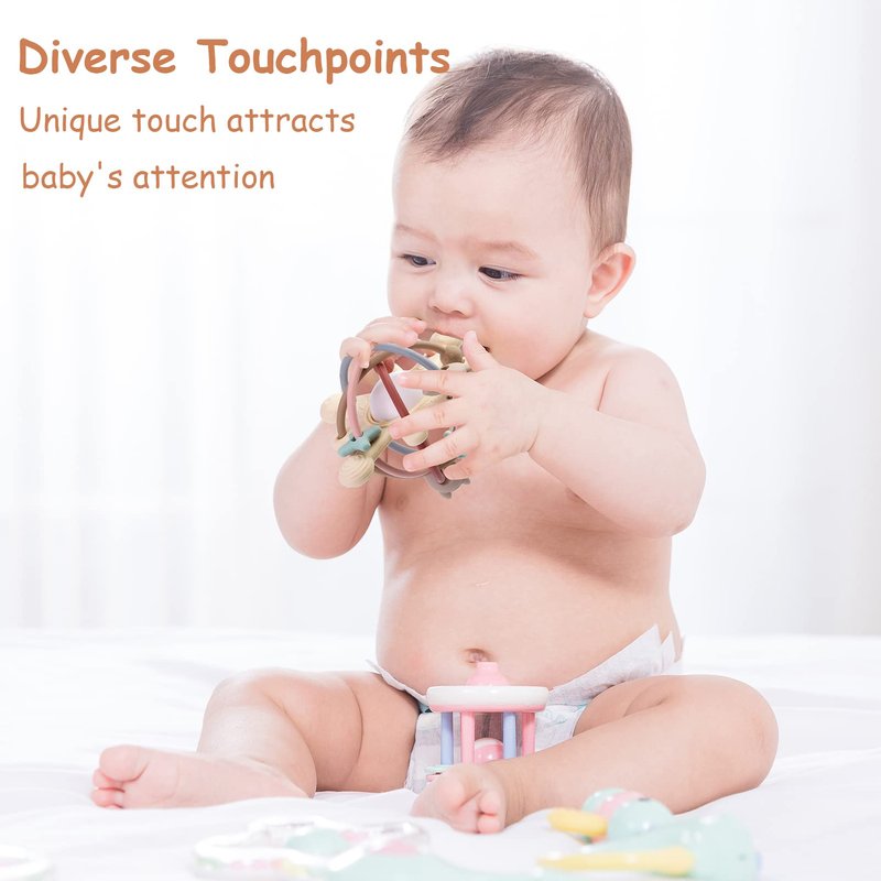- BABY SENSORY TOY: The silicone teething toy is designed for ages 3 months and up, the rich colors develop color cognition ability. Hollow design and suitable size exercise grasping ability and fine motor skill. The gentle rattle sound, which provide hearing stimulus and also soothe baby's anxiety-a perfect shower gift for newborns and new moms.