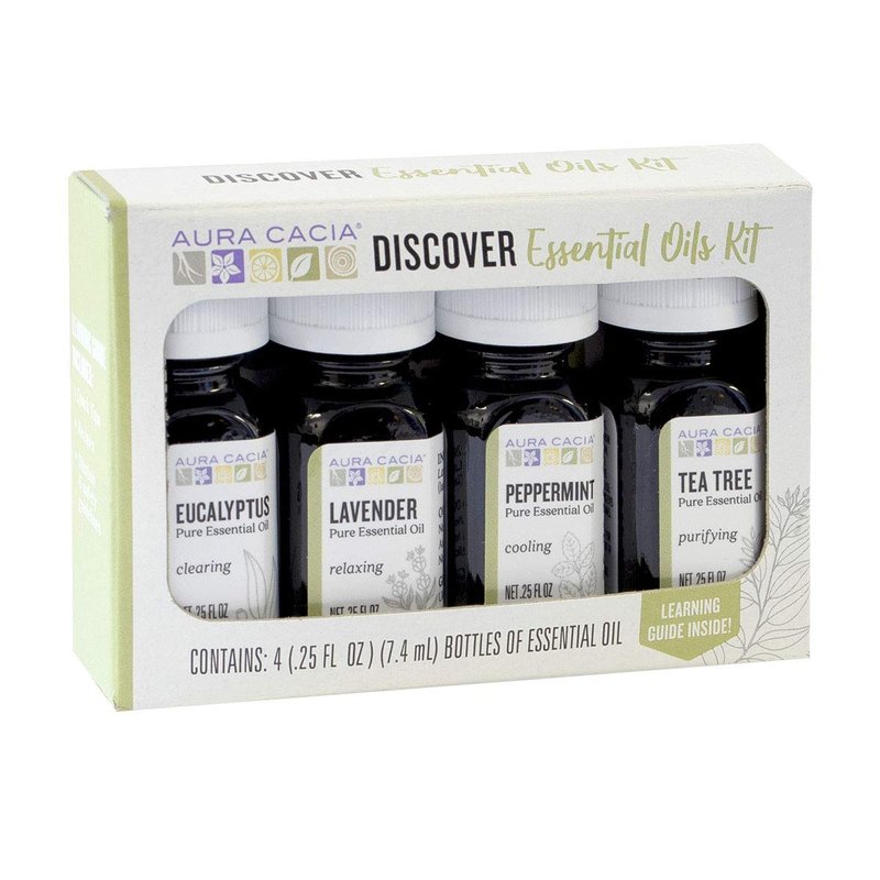 - ESSENTIAL OIL STARTER KIT - New to the world of aromatherapy and essential oils? Checkout our essential oils kit specially crafted for new users and essential oil gurus alike. Aura Cacia Discover Essential Oils Kit helps new users discover four popular and versatile oils in one convenient package.
