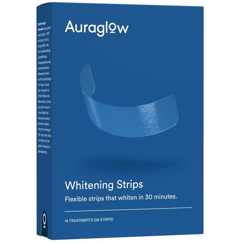 Auraglow teeth whitening strips are the fastest way to whiten your teeth at home. The whitening strips include hydrogen peroxide formula that lifts stains off the teeth from coffee, tea, wine, smoking, soda and more. Simply peel the strips from the backing and apply to the upper and lower teeth. Wear for 30 minutes, then remove to reveal a brighter smile. The teeth whitening strips include 28 strips and 14 treatments to rapidly whiten your teeth at home like the dentist in just 30 minutes. These whitening strips are professional-level whitening strips that remove up to 14 years of stains. Our whitening strips are safe for enamel, sensitivity free and proven to whiten the teeth while removing yellow tooth stains. Choose Auraglow whitestrips, the #1 dentist-recommended at-home teeth whitening brand and get 100% noticeably whiter teeth.