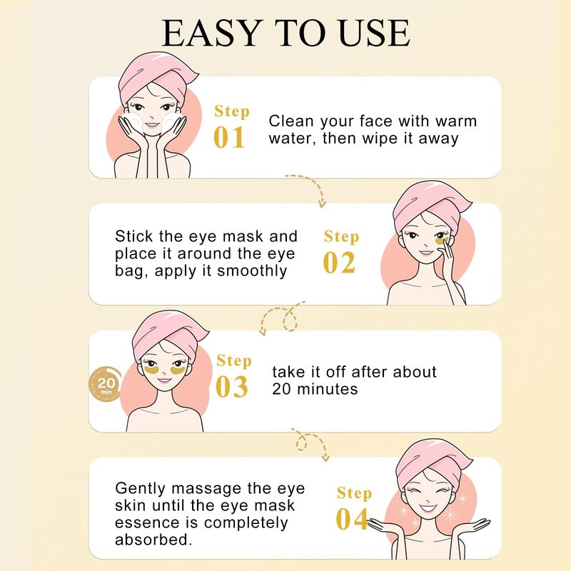 - Easy to Use: Clean your face and eyes with warm water, then stick the eye mask and place it around the eye bag, apply it smoothly, Keep it for 20 minutes, remove the eye pads and gently massage the eye skin until the eye mask essence is completely absorbed.