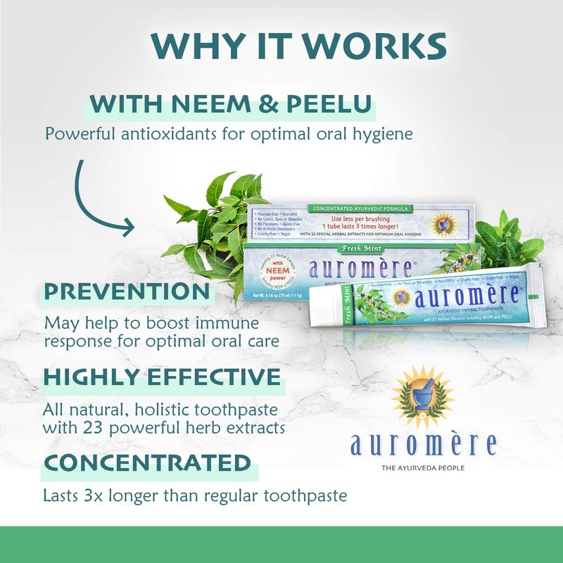 Auromere Ayurvedic Herbal Toothpaste, Fresh Mint - Vegan, Natural, Non GMO, Fluoride Free, Gluten Free, with Neem & Peelu (4.16 oz)