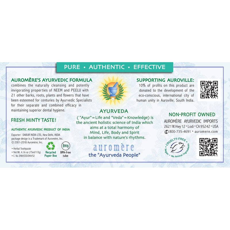 Auromere Ayurvedic Herbal Toothpaste, Fresh Mint - Vegan, Natural, Non GMO, Fluoride Free, Gluten Free, with Neem & Peelu (4.16 oz), 2 Pack