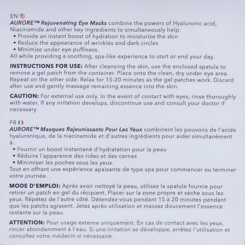 - AURORE Rejuvenating Eye Masks are formulated with high-quality ingredients such as Hyaluronic Acid, Niacinamide, Aloe Vera Extract, Green Tea Extract, Hydrolyzed Collagen, Peptides, and Licorice Extract. These ingredients work together to hydrate, moisturize, and nourish the delicate skin around the eyes, reducing under eye puffiness, fine lines, wrinkles, and dark circles.