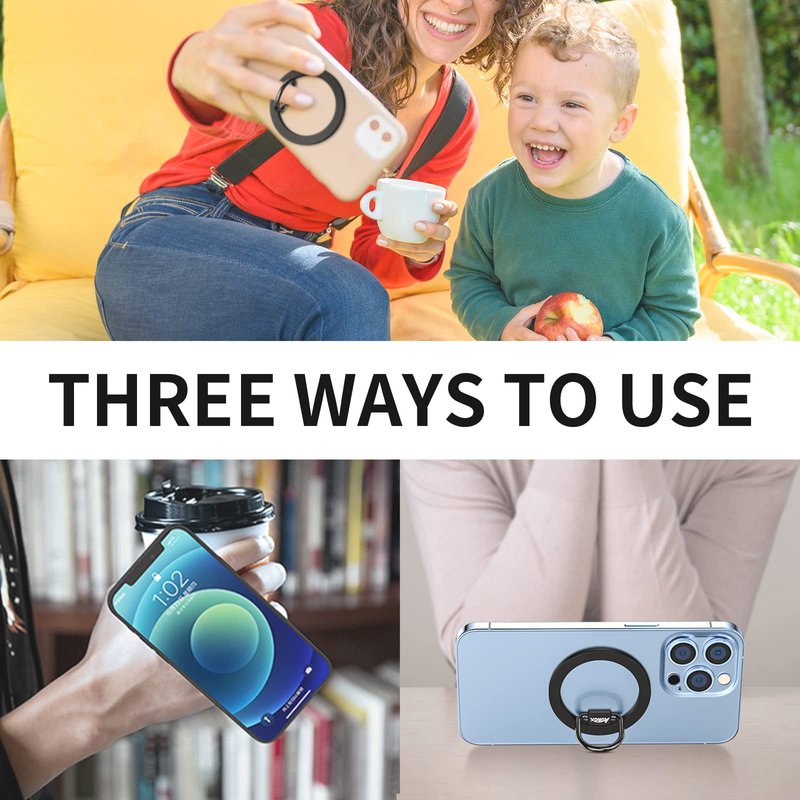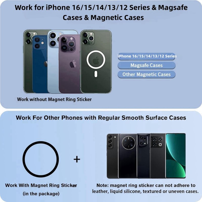 - Two Ways of Use: The magnetic phone ring is designed for iPhone 16/15/14/13/12 series; For iPhone 16/15/14/13/12 series, move magnetic phone finger holder to the back of your compatible with MagSafe case; For other models phone, attach the magnet ring sticker (in the package) to the back of your phone case if you use case; Then stuck the cell phone ring holder on the magnet ring sticker, which is suitable for most smartphones