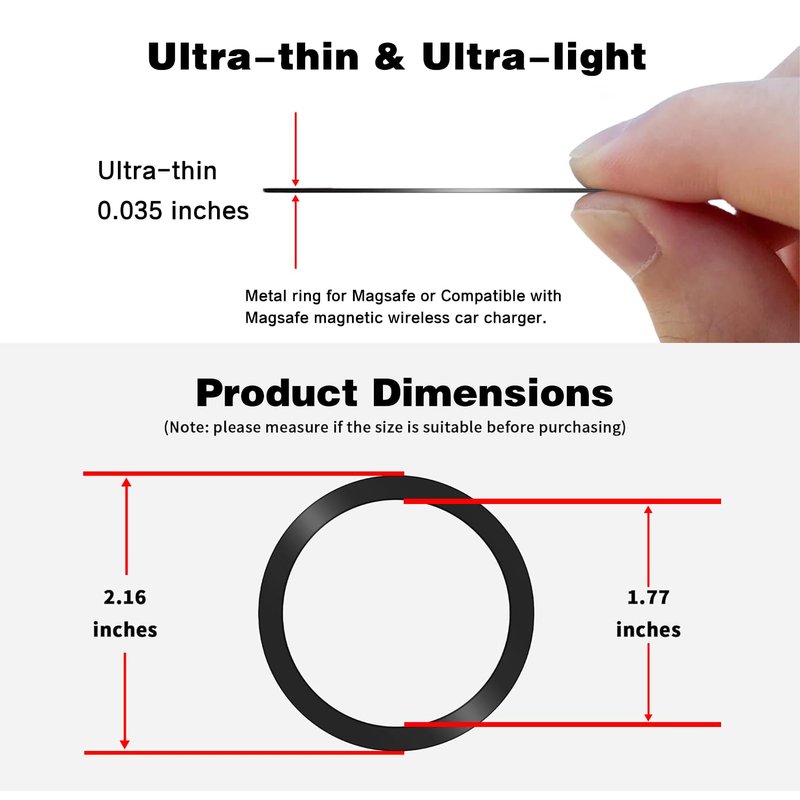 - 【Ultra-thin 0.035 inches Design】This metal ring adhesive sticker ring is designed to be ultra-thin, with a thickness of just 0.035 inches and a weight of only 0.008 lb, the outer diameter is 2.16 inches, and the inner diameter is 1.77 inches. Not only does it avoid adding bulk to your phone, but it's also incredibly lightweight and won't interfere with wireless charging capabilities.