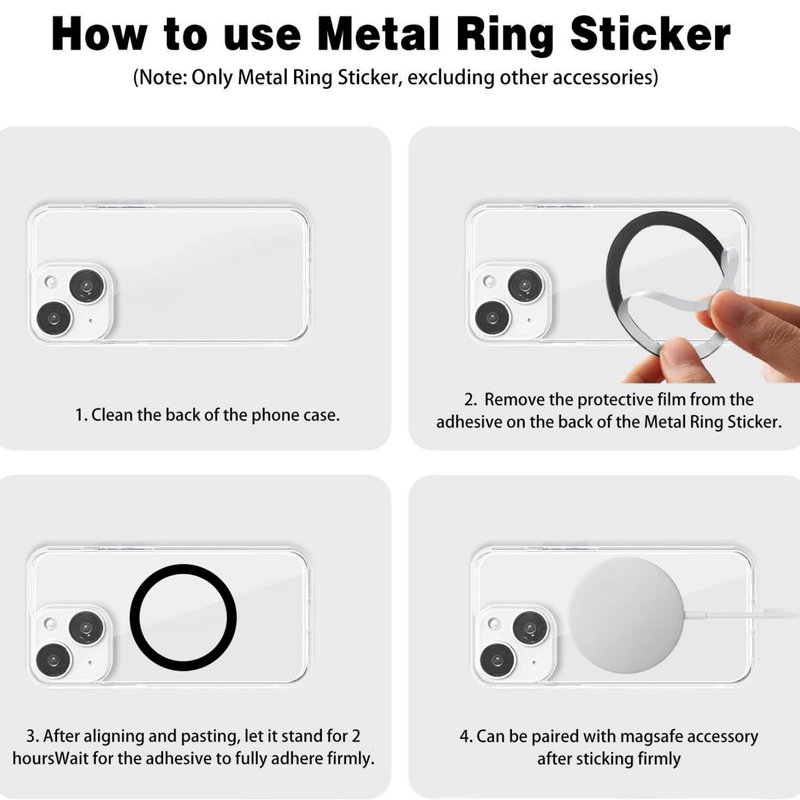 - 【Easy to use】Attach the metal ring sticker to the outside of a smooth, flat phone case; if applicable, select the appropriate wireless charging position of the case, otherwise select the center position of the case. Please choose the correct place before peel off the protective film, It cannot be reused.The metal ring sticker can only be used once.