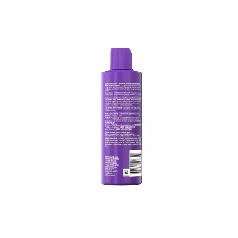 With cocoa butter & Australian macadamia nut oil. Paraben free. Sulfate free. Dry hair looking for a moisture miracle without sulfates? We've got you covered! Our sulfate free shampoo, infused with cocoa butter and Australian macadamia nut oil, cleanses, moisturizes, and makes your hair smell amazing without any sulfates. Yay! Cocoa butter & Australian macadamia nut oil. Yay! Aussome hair days. No way! Parabens & sulfates no way! Hair stress. aussie.com. Follow us and share in the fun! (at)aussiehairusa. (hashtag)AUSSomehair. Questions? 1-800-947-2656. Made in USA of US and/or imported ingredients.