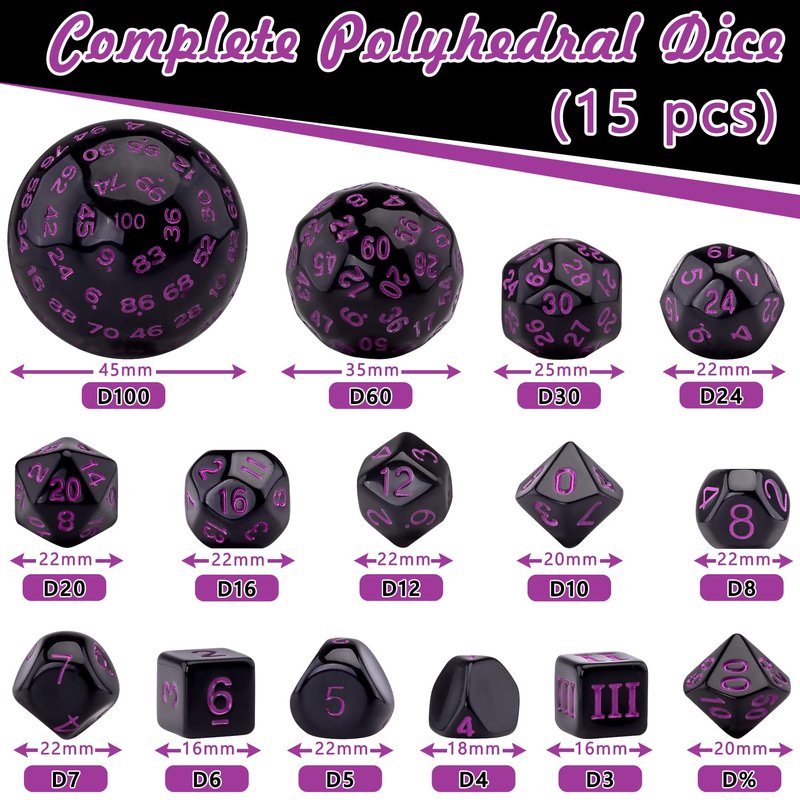 - Package include - 15 pieces polyhedral dice, contains D3,D4,D5,D6,D7,D%,D8,D10,D12,D16,D20,D24,D30,D60 and D100, completed dice set to meet your table game needs