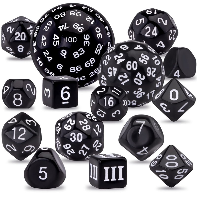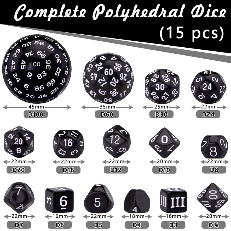- Package include - 15 pieces polyhedral dice, contains D3,D4,D5,D6,D7,D%,D8,D10,D12,D16,D20,D24,D30,D60 and D100, completed dice set to meet your table game needs