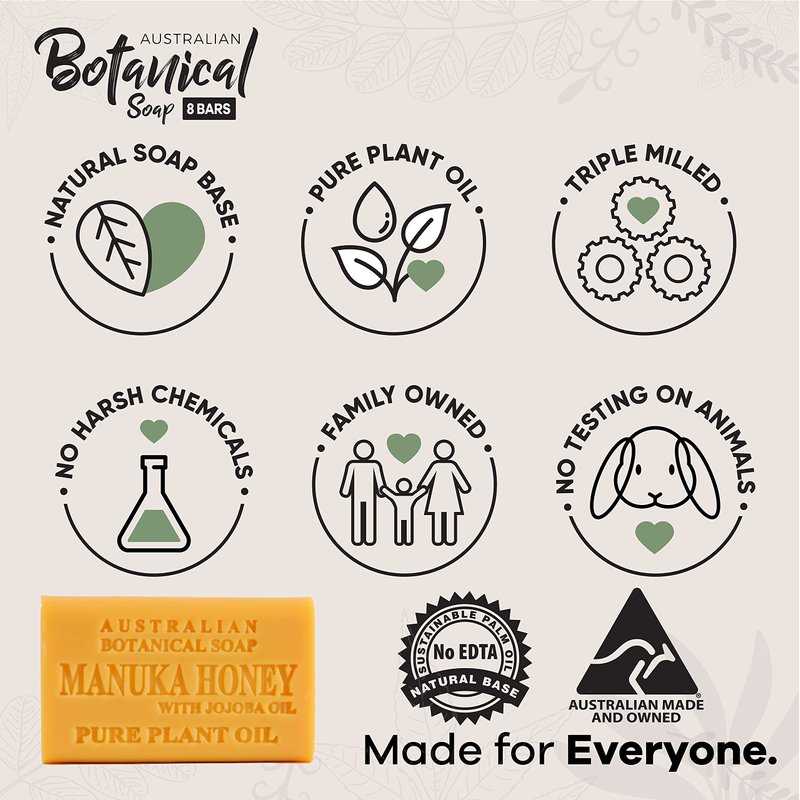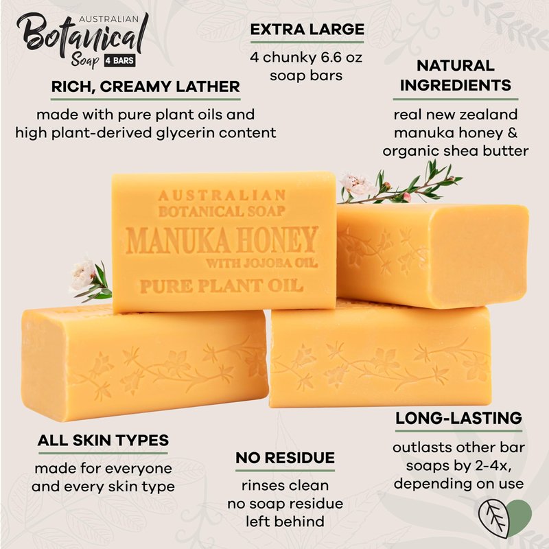 Australian Botanical Soap, Manuka Honey with Jojoba Oil 6.6 oz. (187g) Soap Bars | Natural Ingredient Bar Soaps | All Skin Types | Shea Butter Enriched - 4 Count