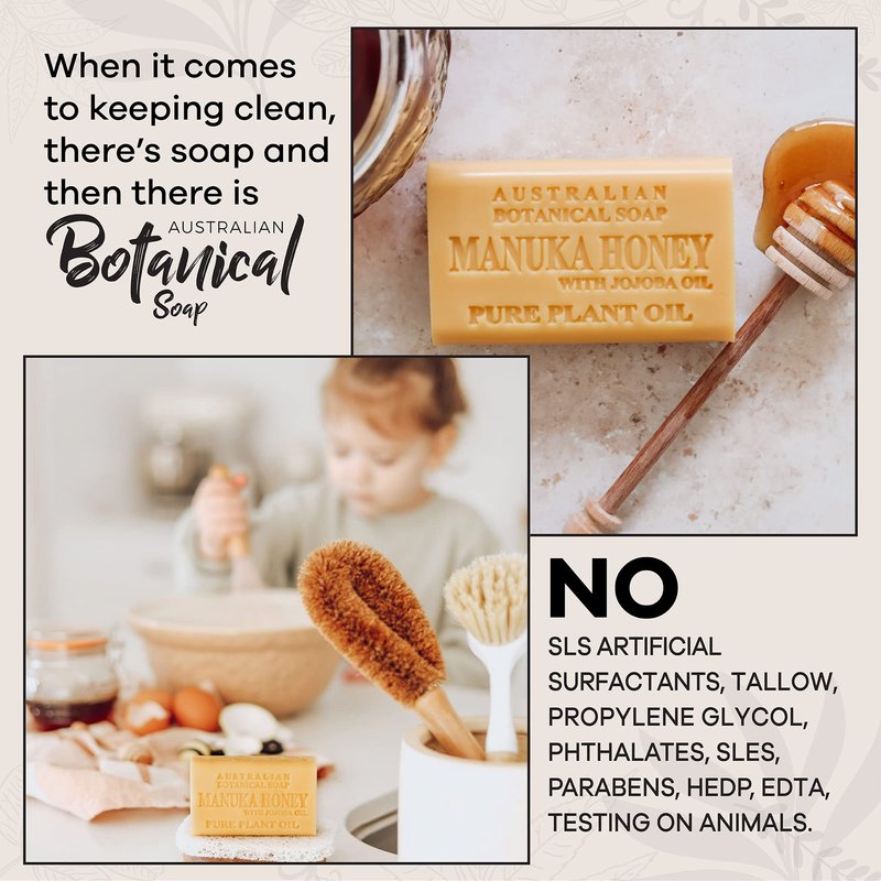 - Sustainably Sourced Plant Oils - Plant oils sourced from sustainable plantations create a high glycerin content to moisturize the skin and leave it smooth and soft. No harsh ingredients are ever added to Australian Botanical Soap.
