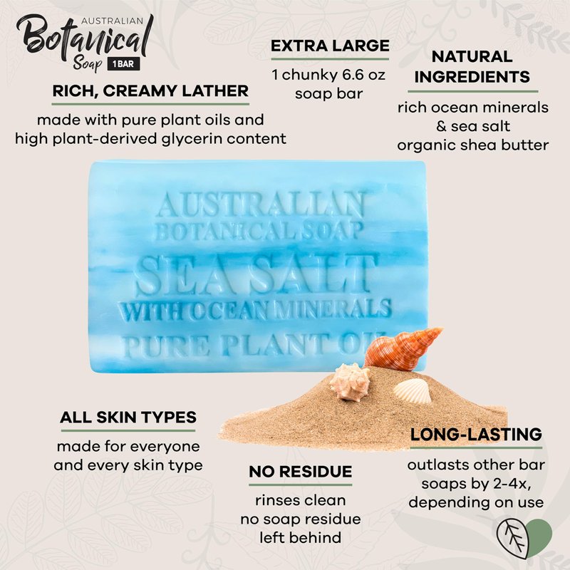- Rich Ocean Minerals and Sea Salt - Australian Botanical Soap Sea Salt with Ocean Minerals provides a refreshing wash reminiscent of an early morning beach stroll. This Sea Salt soap is enhanced with rich mineral deposits found in the Camargue region of France and will work to visibly tone and soften the appearance of skin.