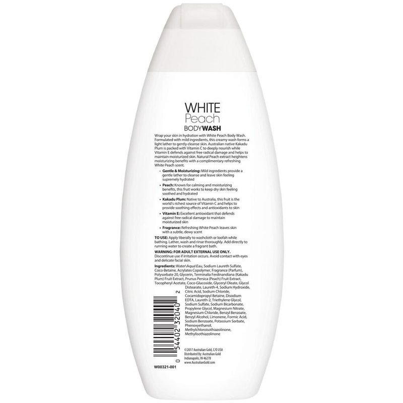 - MILD MOISTURIZING BODY WASH - Pamper your skin with Australian Gold's White Peach Body Wash; Formulated with mild ingredients, it forms a gentle lather to cleanse your skin and leaves it feeling supremely hydrated and luxurious