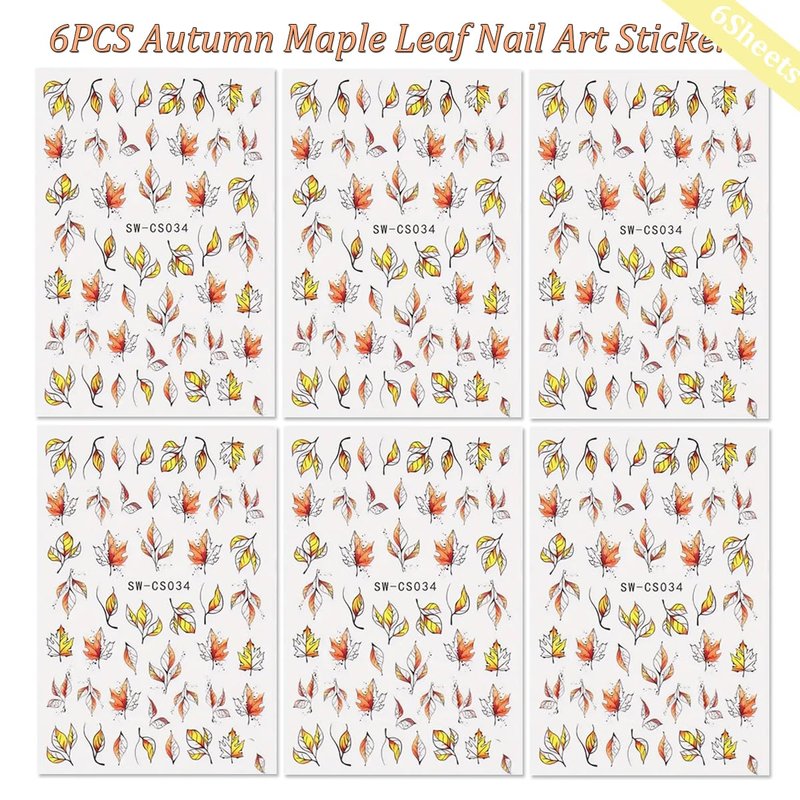 Autumn Maple Leaf Nail Art Stickers Fall Leaf Nail Decals 6PCS Leaf Plant 3D Self-Adhesive Nail Art Supplies Decals Fall Sticker for Nails Holiday Manicure Accessories for Women Nail Art Decorations