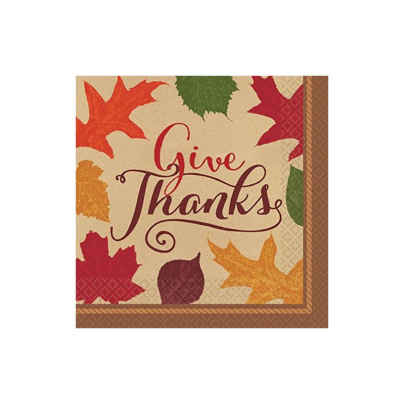 Add our Autumn Traditions Beverage Napkins to your Thanksgiving tables! Each napkin features a kraft background with colorful fall leaves and the message "Give Thanks". Measures 5" x 5" when folded. Includes 36 - 2 ply napkins per package.