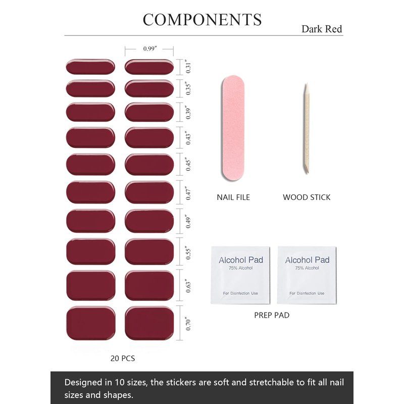 - 【UV Nail Stickers Kit】- Each box includes 20 easy to use semi cured gel nail sticker in 10 different sizes. It also comes with 2 prep pads, 1 nail file, and 1 wooden stick.
