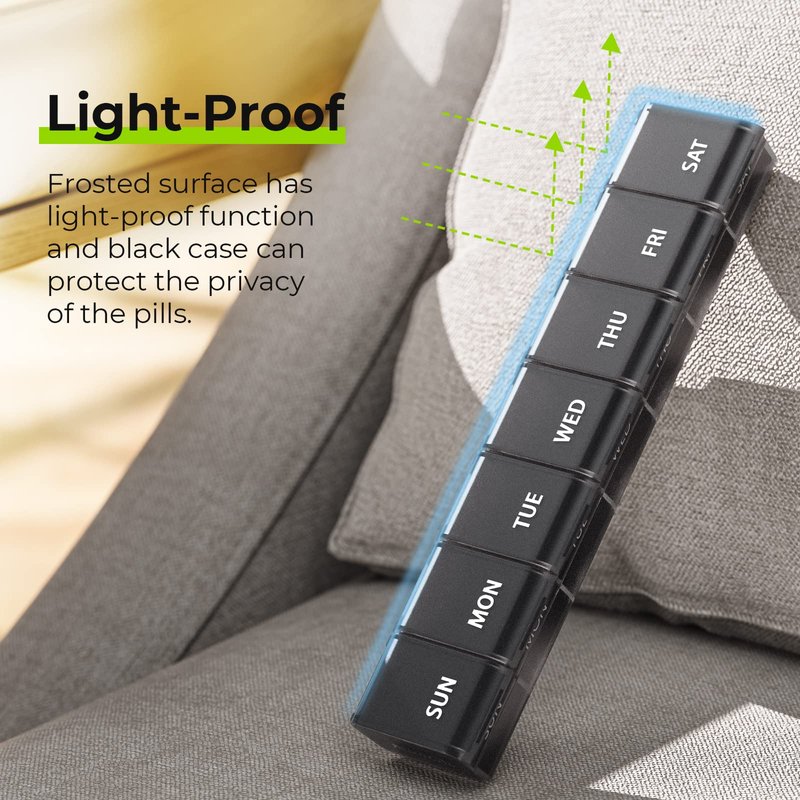 Privacy Protection. The frosted black surface is lightproof to avoid pill deterioration and protect medication privacy. Made of food-grade material, the pill holder is safe for your daily use.