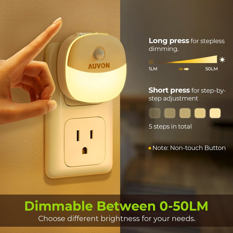 AUVON dimmable night light has 5 levels of brightness and can be dimmed steplessly or step-by-step. Short press to adjust among 5 steps or long press to adjust within 1-50 lm.