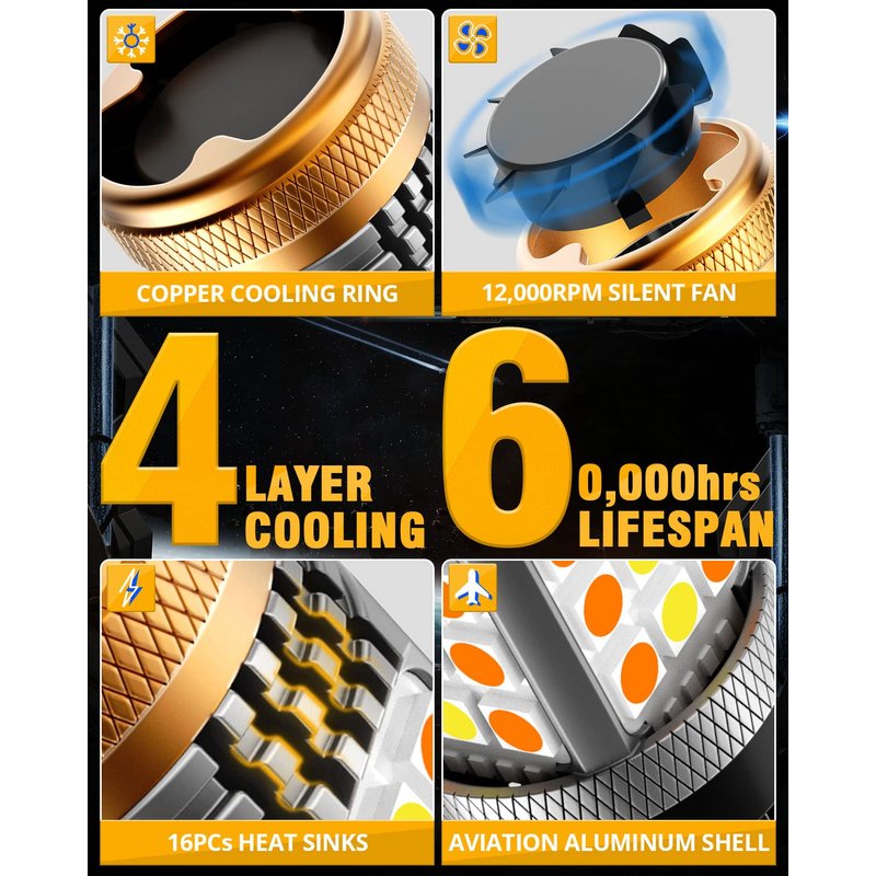 - 【4-LAYER COOLING SYSTEM】IP68 waterproof and dustproof. The built-in 2023 stable current IC driver avoids digital or VHF radio signal interference. The 2023 latest cooling system - 12,000RPM silent fan + Copper cooling ring + 16Pcs heat sinks + 6063 aviation aluminum lamp body directly doubles heat dissipation, ensuring longer lifespan up to 60,000 hours.
