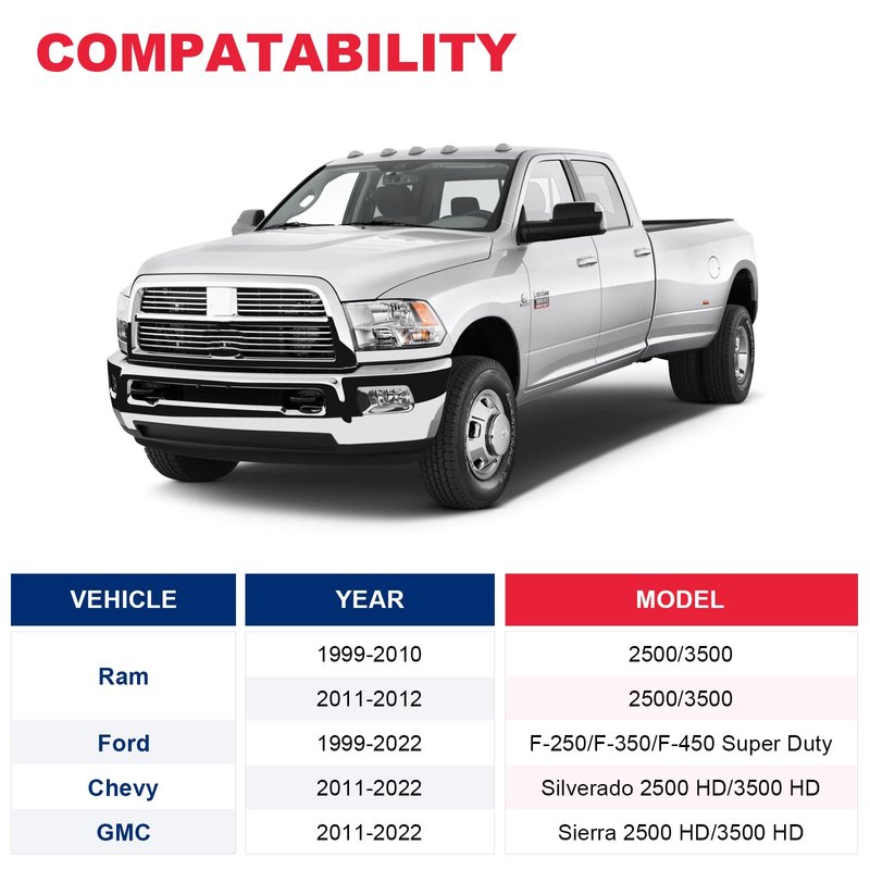 - 【Compatible】Compatible with 1999-2022 Ford F-250/F-350/F-450 Super Duty; 1999-2010 Dodge Ram 2500/3500; 2011-2012 Ram 2500/3500; 2011-2022 Chevy Silverado 2500 HD/3500 HD; 2011-2022 GMC Sierra 2500 HD/3500 HD.