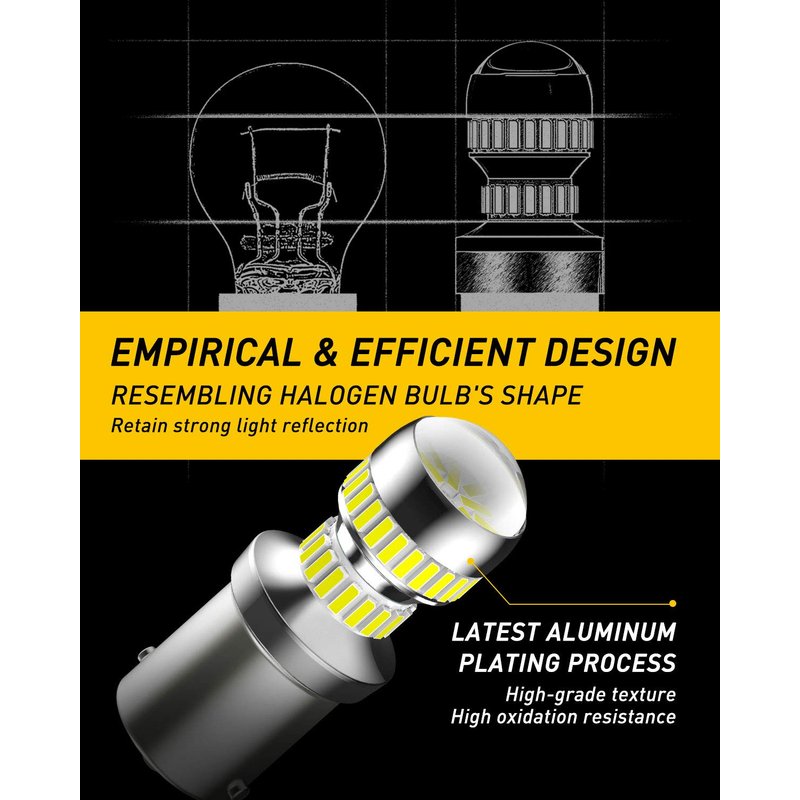 - Resembling halogen bulb shape design and sequencing 54 4014-SMD LED chips precisely around the bulb. Delivering 360° high luminous efficiency with full 6000K white light, see more clearly and safely when reversing