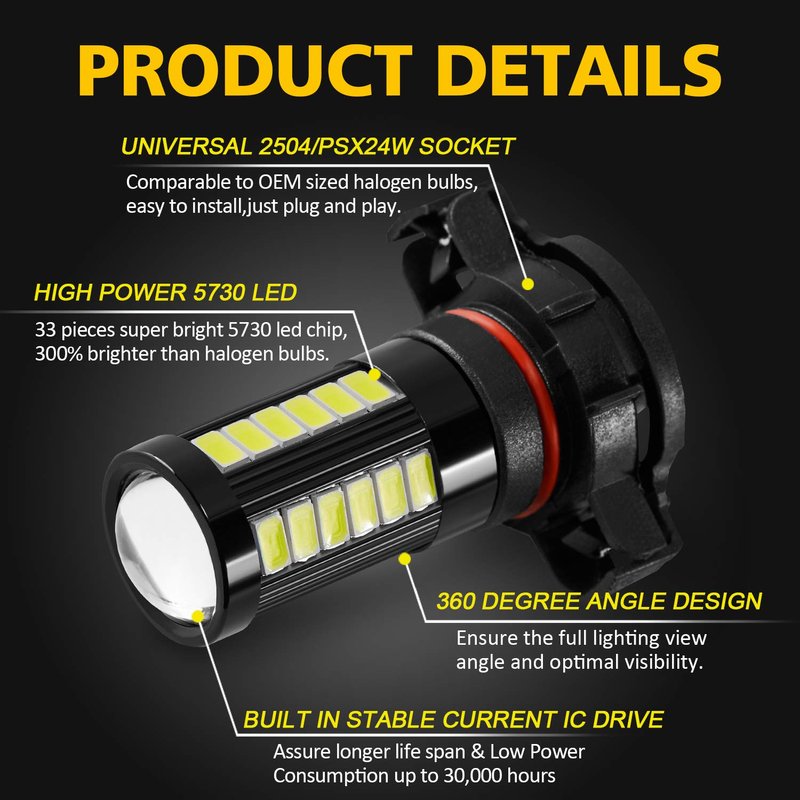 - ▼Extremely bright with good visibility: Each 2504 LED light bulb is equipped with 33 pieces 5730 LED chips, full aluminum housing with projection lens for better focusing light effect, 360 degree beam angle for maximum light output and further lighting distance. IP67 waterproof makes it work in any bad weather conditions, becoming the best choice for driving at rainy, fogy, or snowy days absolutely.