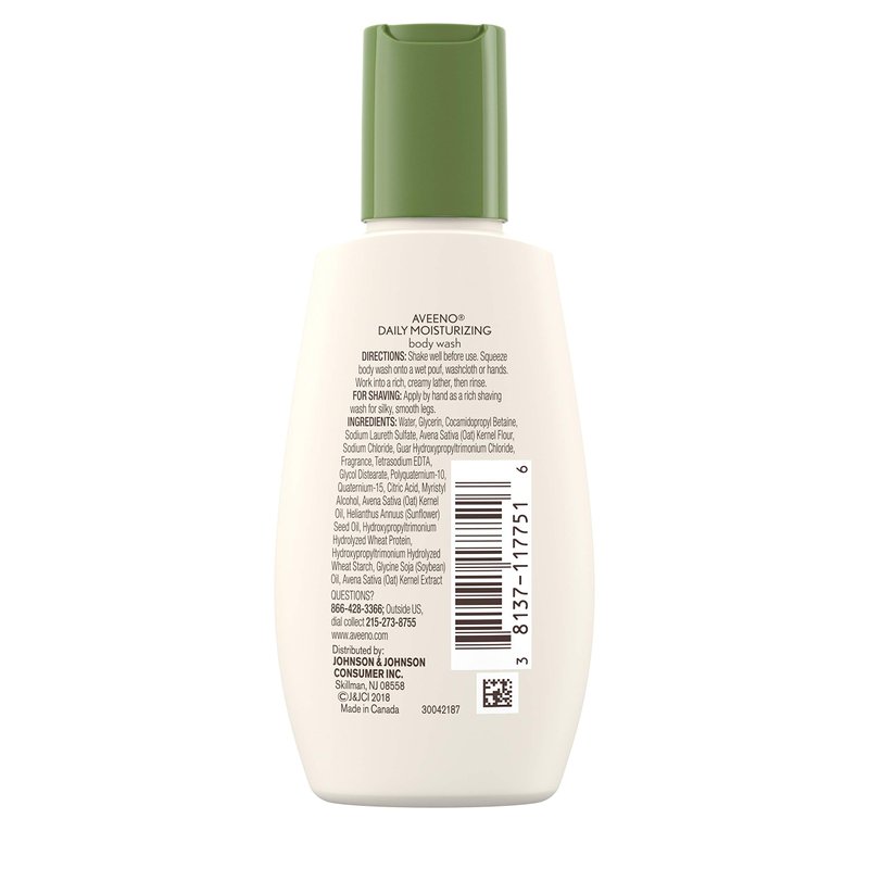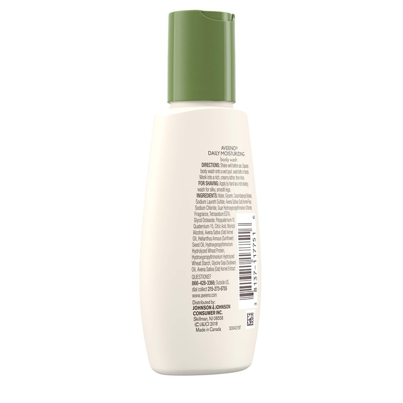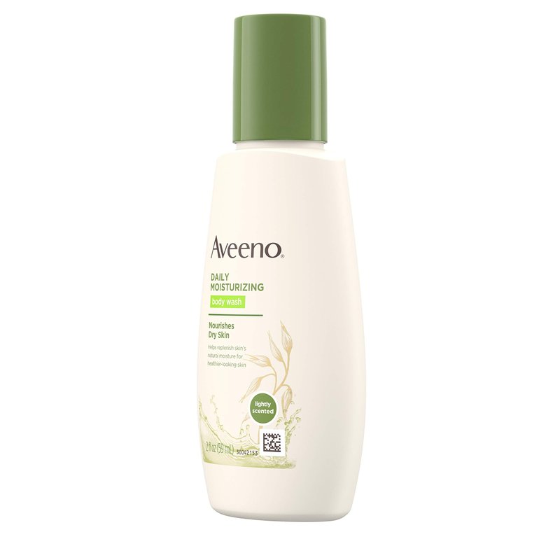 - 2-fluid ounce bottle of Aveeno Daily Moisturizing Body Wash with Nourishing Oat to help replenish skin's natural moisture