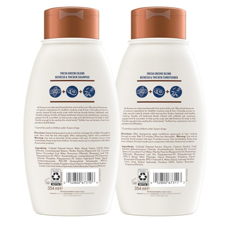 Aveeno Fresh Greens Shampoo + Conditioner with Rosemary, Peppermint & Cucumber to Thicken & Nourish, Clarifying & Volumizing Shampoo for Thin or Fine Hair, Paraben-Free, 12 Fl Oz, 2 Count (Pack of 1)