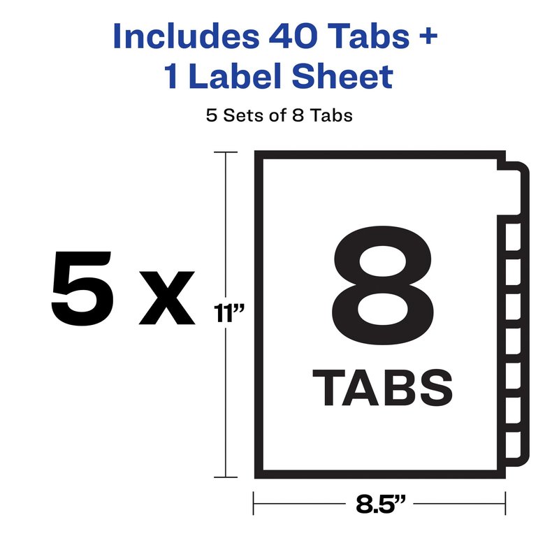 Avery 8 Tab Dividers for 3 Ring Binder, Easy Print & Apply Clear Label Strip, Index Maker Customizable Multicolor Tabs, 5 Sets (11419)