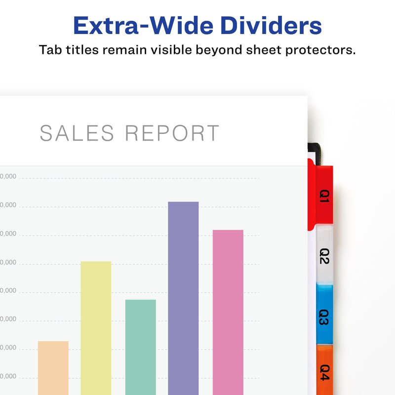 - Easily access sections with extra wide binder dividers that extend beyond sheet protectors
