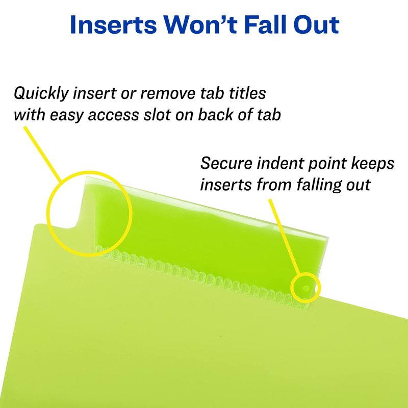 - Each 3-ring binder divider tab features an easy access slot as well as a secure indent point to lock inserts in place