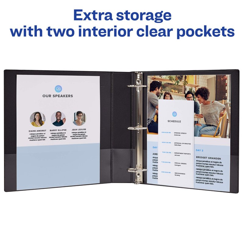 - Wider front and back panels fully cover standard dividers and sheet protectors.