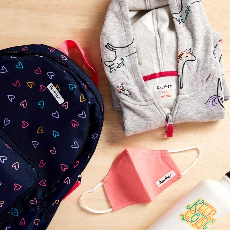 - Label stickers are backed with a permanent adhesive that can be applied to a wide range of smooth surfaces, including fabric, water bottles, luggage, school supplies, and more with no iron required